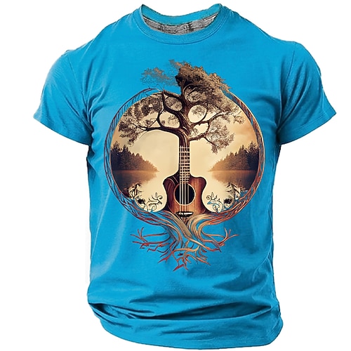 Maglietta da uomo con grafica albero della vita e chitarra acustica, tema natura, radici, surrealismo, musica, arte, folk, musicista, regalo, tramonto, paesaggio, stampa, casual, manica corta,