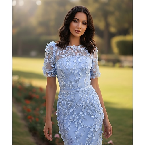 Tubino Colonna Lunghezza Tè Abiti da Cocktail Abito da Sera Abiti da festa Elegante Scintillante Stile Celebrità Manica Corta Girocollo Festa in giardino Matrimonio Pizzo con Perline Applicazioni