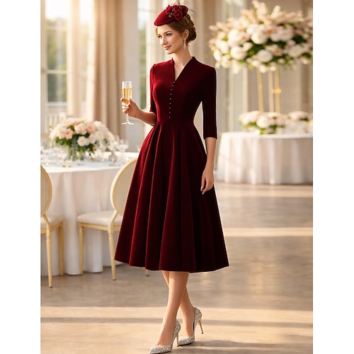 Linea ad A Lunghezza Tè Abiti da Cocktail Abiti da festa Vintage Festa Abito Nero Mezza Manica Scollo a V Ospite di nozze Abbigliamento da Festa Invitato a matrimonio autunnale Velluto con Elegante