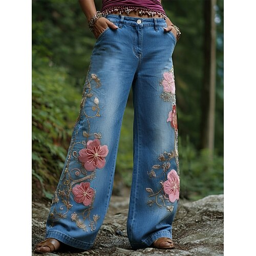 Per donna Grafica Gamba larga Chinos Vacanza Vintage Moda Lunghezza intera Vita Alta Floreale Tasca Stampa Comodo Morbido Confortevole Micro-elastico All'aperto Vacanza Streetwear Blu Primavera