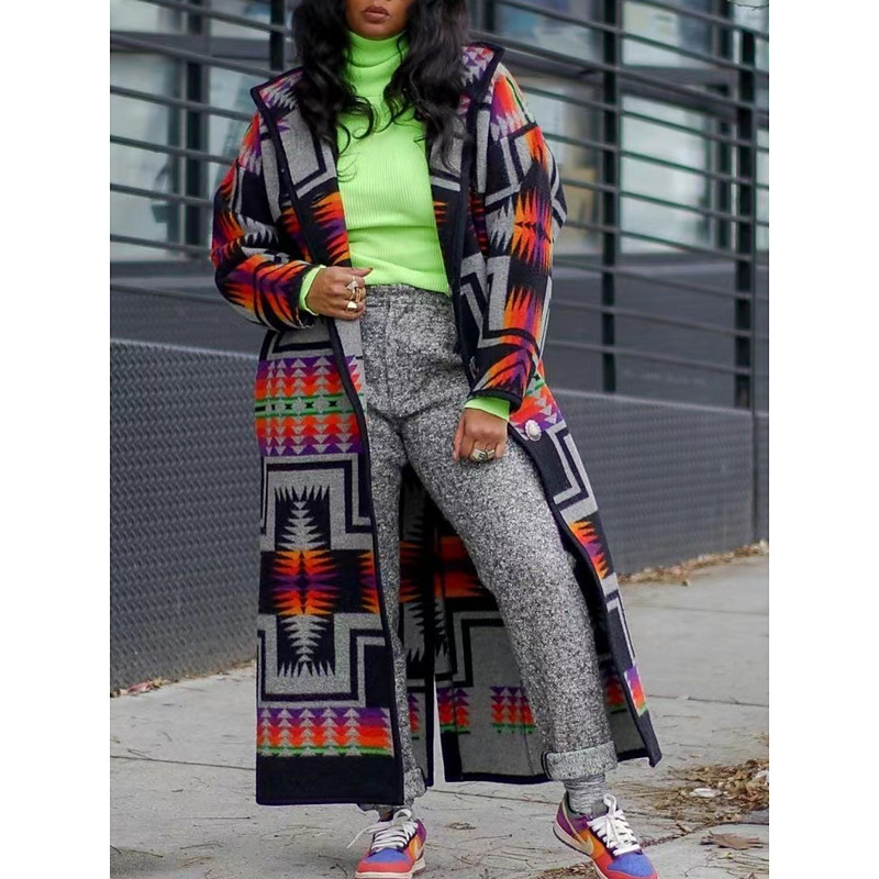 Women's Winter Jacket Comfortable Breathable Pocket Print Open Front Casual Geometric Vacation Street Casual Daily Wear Open Front Long Turndown Regular Fit Long Sleeve Outerwear Black Yellow Spring