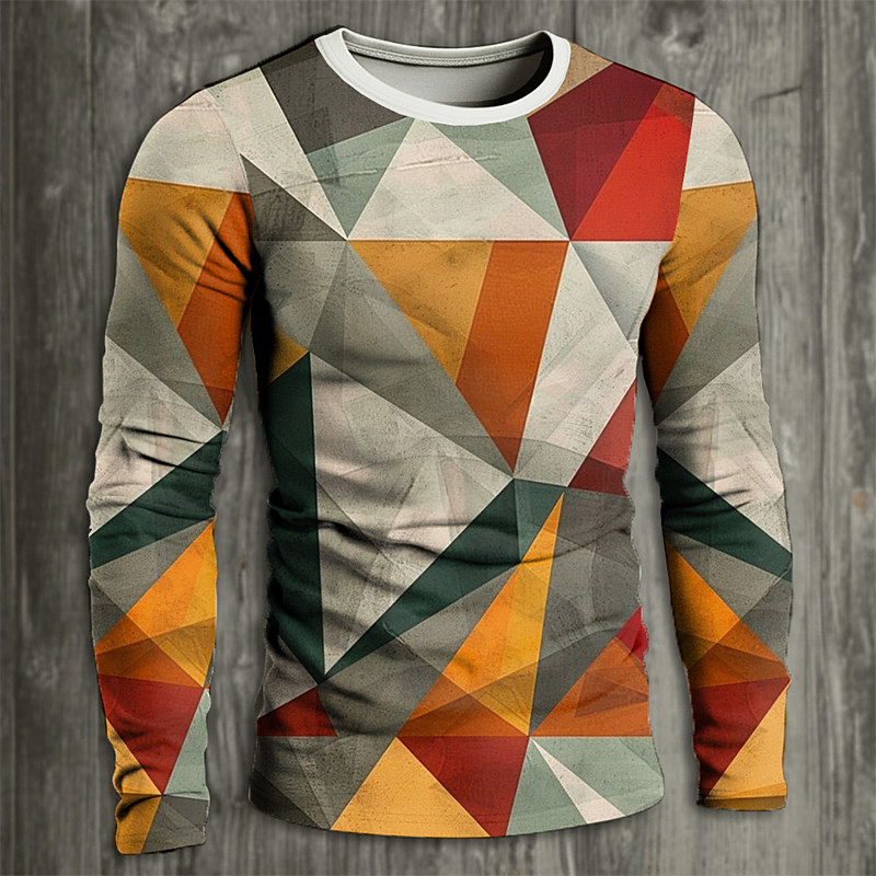 Men Retro Geometric Print Long Sleeve T Shirt Vintage Color Block Triangle Graphic Casual Abstract Art Crew Neck Pullover Tops Clothing Apparel S M L XL XXL XXXL
