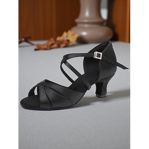 scarpe da ballo latino da donna in raso nero con cinturini incrociati, fibbia di strass, punta aperta, tacco alto - calzature professionali da sala da ballo per competizioni e allenamenti