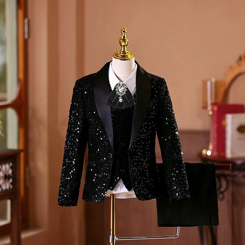 5 Pieces Ring Bearer Suit Boys' Kids Suit Blazer Vest Pants Shirt Tie Boy's Formal Suit Casual Outdoor Party Fashion Cool Basic Solid Color Sequins Pocket Buttons Black Polyester