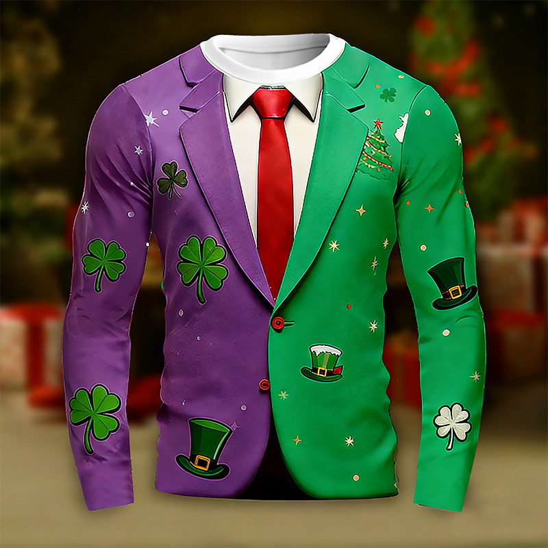 St. Patrick Men's Shamrock Lucky Irish Tuxedo T Shirt Long Sleeve T shirt 3D Print Crew Neck Shirt Designer Casual Club Party Holiday Red Purple Orange Summer Spring Clothing Apparel S M L XL XXL XXXL