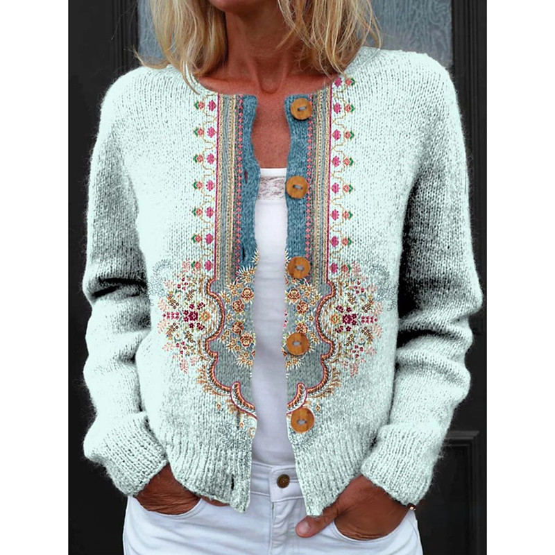 Women's Cardigan Sweater Knitted Ribbed Button Front Round Neck Long Sleeve Lightweight Daily Floral Crew Neck Buttons Print Regular Tops Knit Outdoor Weekend Red Green Spring Fall
