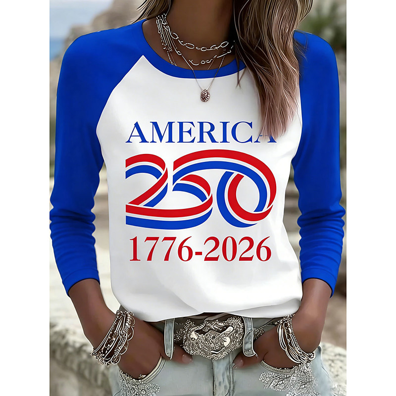 American Independence Day Women's T Shirt Graphic Letter Vintage Stylish Classic Long Sleeve Crew Neck Regular Tops Daily Weekend Print Blue Red Summer Spring Fall Winter