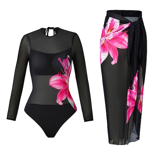 Costume da bagno intero da donna snellente con gonna monokini gonna in rete controllo della pancia vita alta slanciato elegante abbigliamento da spiaggia per le vacanze floreale collo rotondo maniche