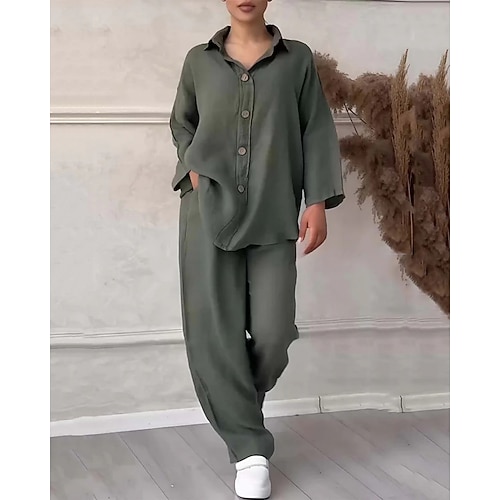 Per donna Moda Streetwear Camicia Set di biancheria in cotone Set di Pantaloni Manica Lunga Colletto a Camicia Semplice Casuale Quotidiano All'aperto Bianco Rosa Verde militare Primavera Vestibilit