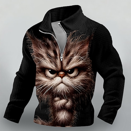 Felpa da uomo con cerniera a un quarto, stampa 3D di gatto arrabbiato, pullover a nido d'ape, manica lunga, casual, felpe con grafica di animali divertenti, abbigliamento, abbigliamento S M L XL XXL