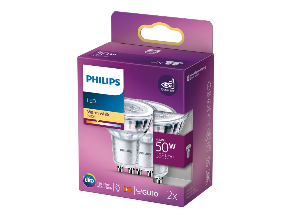 Philips - LED-spot lyspære - GU10 - 4.6 W (tilsvarende 50 W) - klasse F - varmt hvidt lys - 2700 K (pakke med 2)