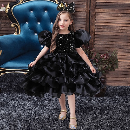 Abito da damigella d'onore bambina Ragazze Abito formale Abiti da sposa Feste Matrimonio Formale Adorabile Formale Bello Paillettes Patchwork Tinta unica Maniche Corte Girocollo Blu Nero Dai 4 anni