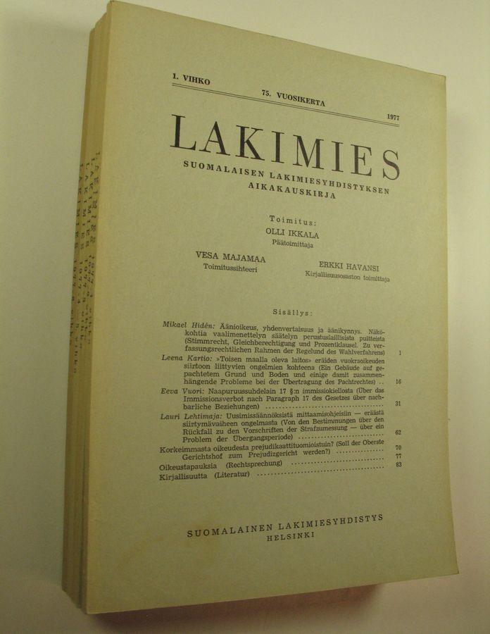 Olli Ikkala : Lakimies, 75. vuosikerta (1977), numerot 1-8 (numerot 4 ja 5 samassa vihossa) : suomalaisen lakimiesyhdistyksen aikakauskirja