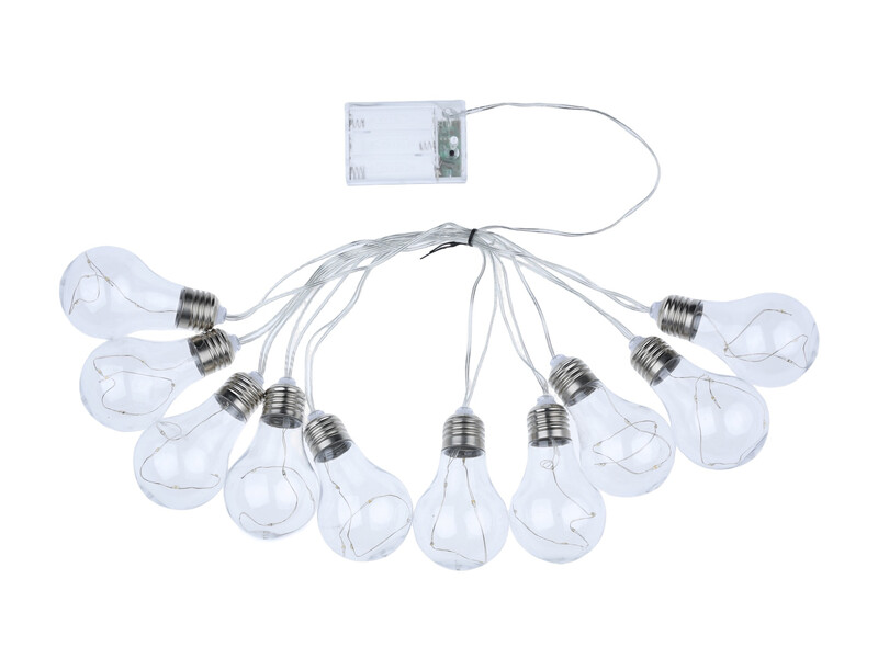 Globe LED String Lights with Clear Plastic Bulbs | 10×5L Warm White LEDs, 10 Bulbs (6×9cm/bulb), 30cm Spacing, 50cm Transparent Cord, Silver Metal Base | With 3AA Battery Box (Indoor/Timer), Battery Not Included