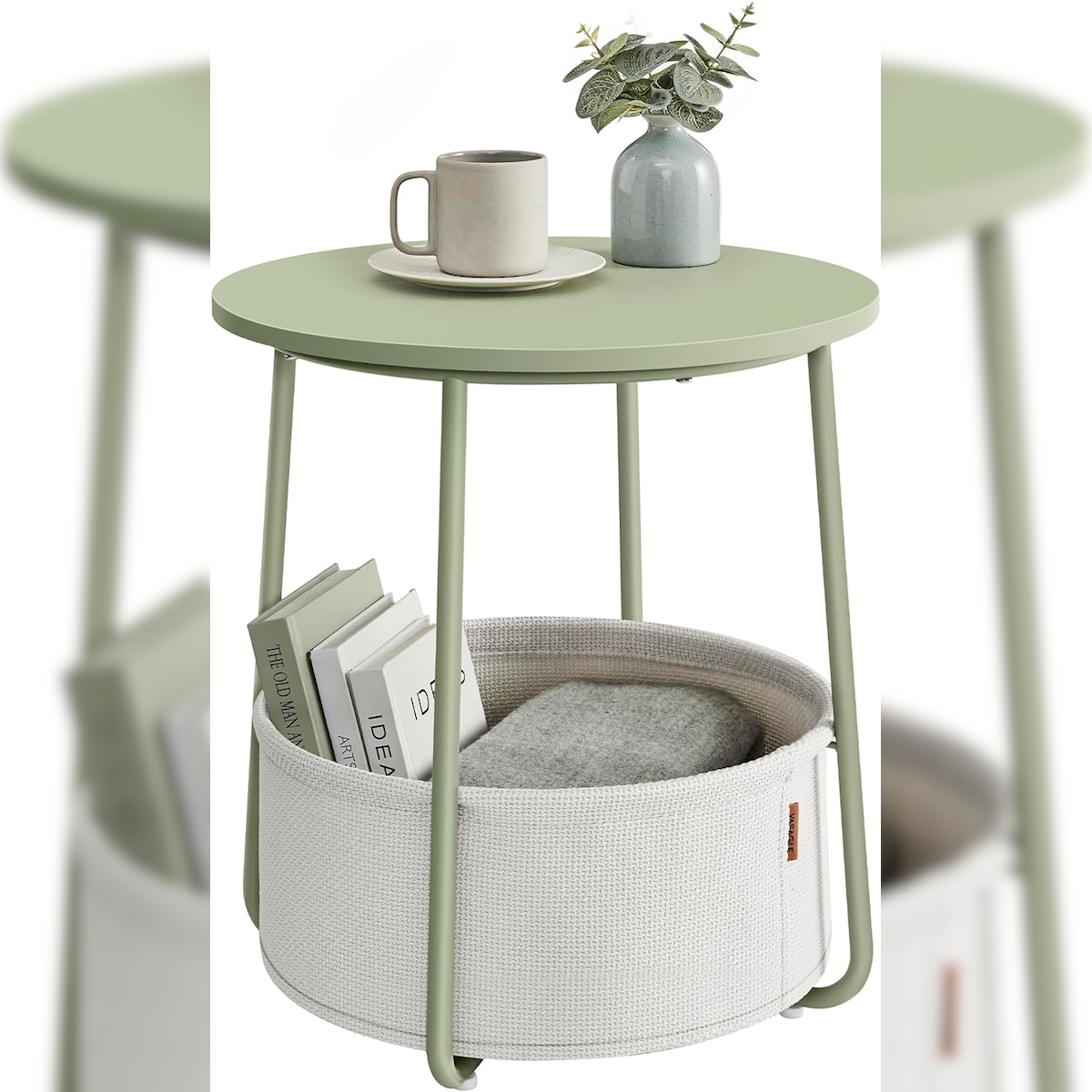 Beistelltisch rund aus Metall, Kleiner Tisch, Couchtisch mit Korb, Wohnzimmertisch, Korb aus Stoff, Nachttisch modern,lorbeergrün-cremeweiß