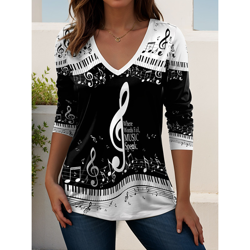Music Festival Women's T shirt Long Sleeve V Neck Long Sleeve Tunic Graphic Music Vintage Stylish Classic Regular Tops Daily Going out Weekend Print Black and White Black White Spring Fall Prefall