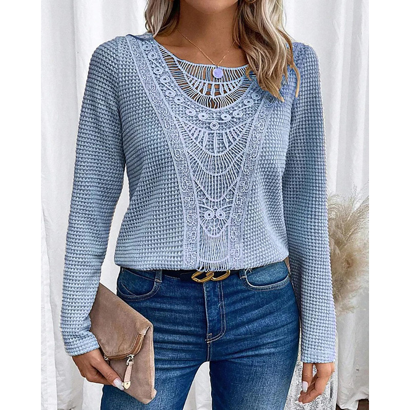 Women's Blouse Plain Vintage Stylish Long Sleeve Crew Neck Regular Tops Daily Holiday Going out Lace Patchwork Black White Pink Wine Navy Blue Spring Fall