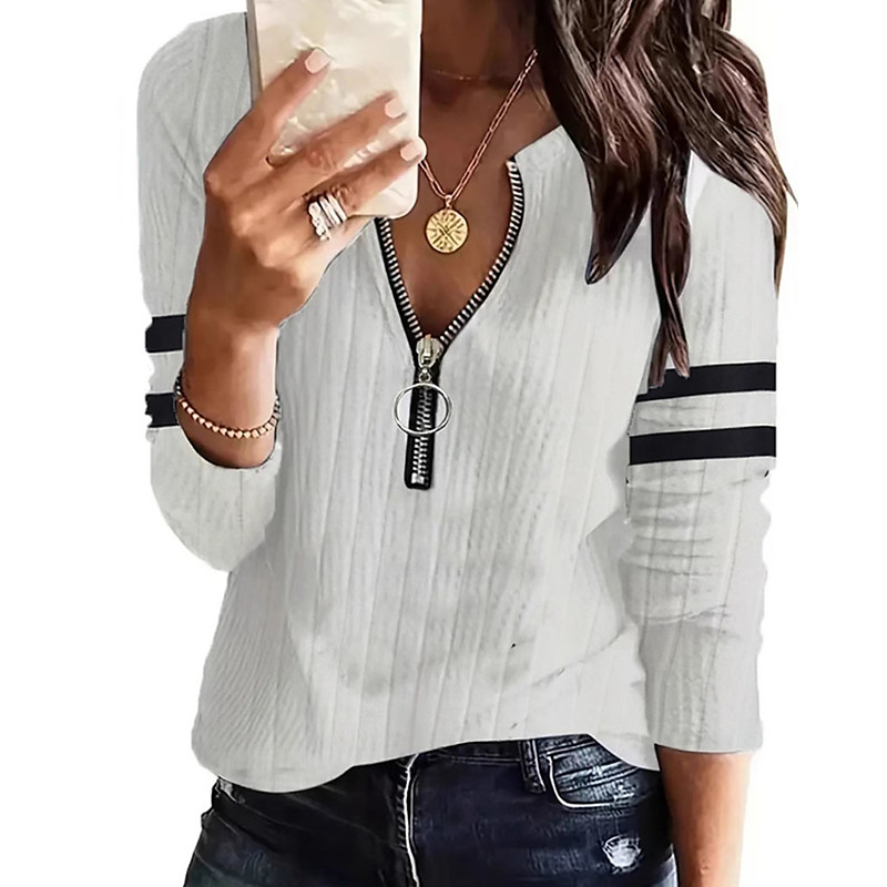 Women's Pullover Sweatshirt Plain Striped Elegant Warm Fashion Long Sleeve Crew Neck Regular Tops Home Work Street Patchwork Half Zip White Fall Winter