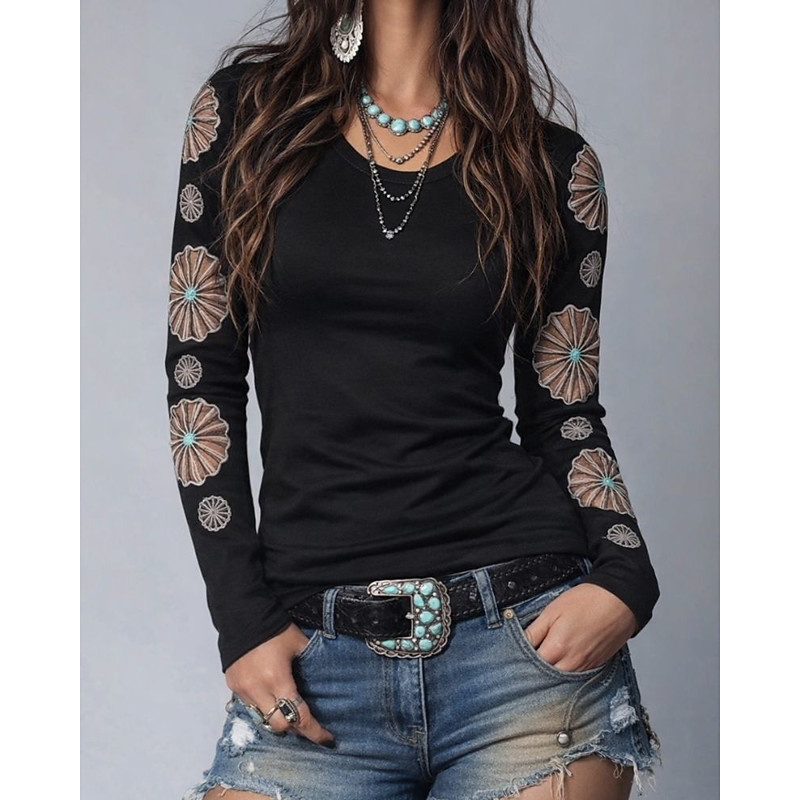 Women's T Shirt Tee Top Solid Color Fashion Classic Casual Long Sleeve Crew Neck Regular Tops Daily Going out Weekend Embroidered Eyelet Black Spring Fall
