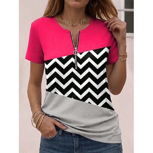 Per donna Maglietta Cerniera Blocco di colore Grafico Geometrico Blocco di colori Vintage Hawaiano Elegante Manica Corta Girocollo Top Regolari Quotidiano Sportivo Weekend Blu Rosa Viola Verde Estate