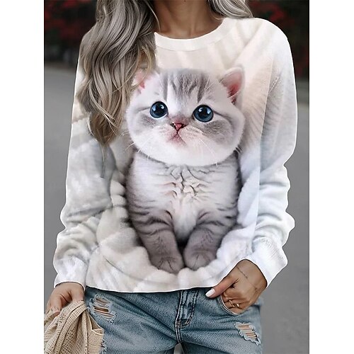 maglietta da donna moda gatto lettera stampa manica lunga top regolari scollo rotondo quotidiano fine settimana nero rosa viola grigio primaveraamp; autunno