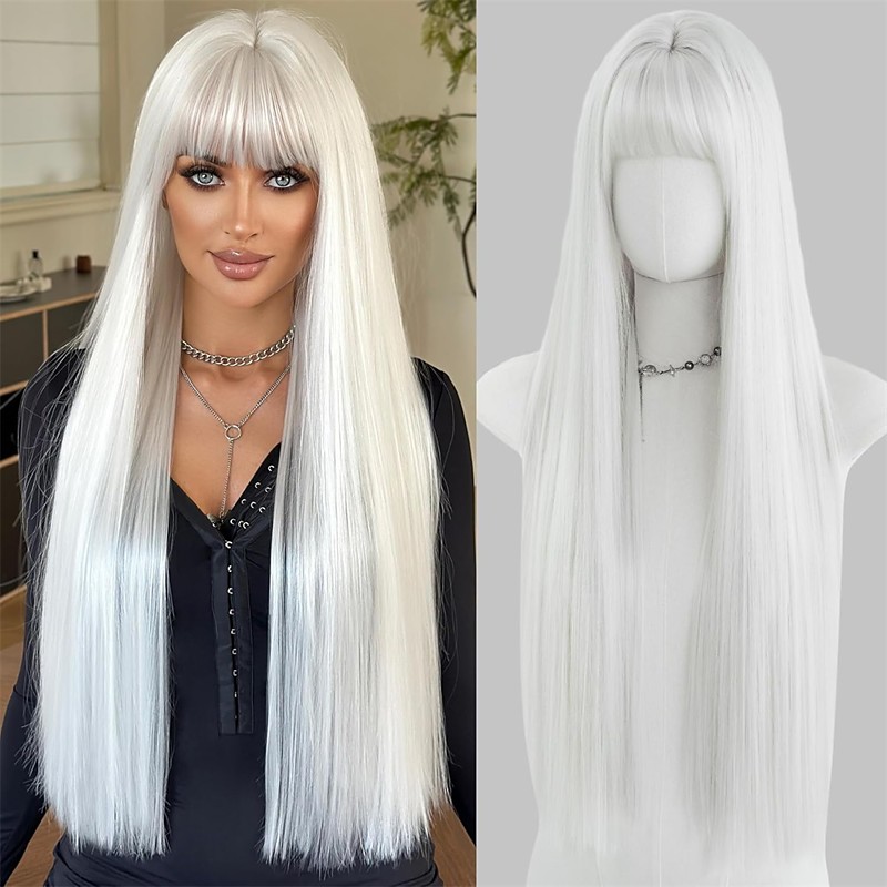 Synthetic Wig Straight Natural Straight Middle Part Neat Bang Wig Very Long White Synthetic Hair 36 inch Women's Soft Comfy White