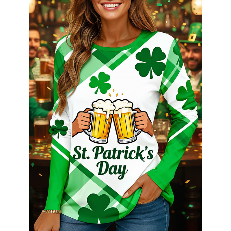 St. Patrick's Day Women's T Shirt Graphic Shamrock Beer Fashion Stylish Classic Long Sleeve Crew Neck Regular Tops Daily Weekend Vacation Wear Print Green Summer Spring Fall