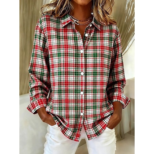 Per donna Camicia Blusa Grafico Geometrico Plaid Vintage Quotidiano Elegante Manica Lunga Colletto a Camicia Top Regolari Quotidiano Patchwork Bottoni Stampato Blu Giallo Rosa Vino Rosso Primavera