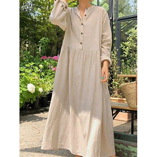 Per donna Nero Vino Kaki Estate Primavera Abito lungo maxi Abiti in cotone e lino Abito Camicia Vestito Casual Essenziale Moderno Quotidiano Weekend Vestibilità comoda Semplice Collo a Spacco