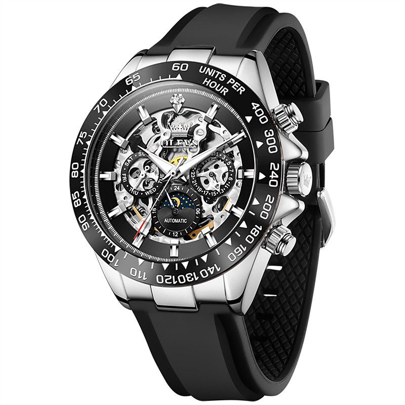 The New Olevs Silicone Men'S Business Watch With Luminous Calendar And Moon Phase Display A Multi-Functional Fully Automatic Mechanical Watch Is A Fashionable Casual Waterproof Sports Wristwatch