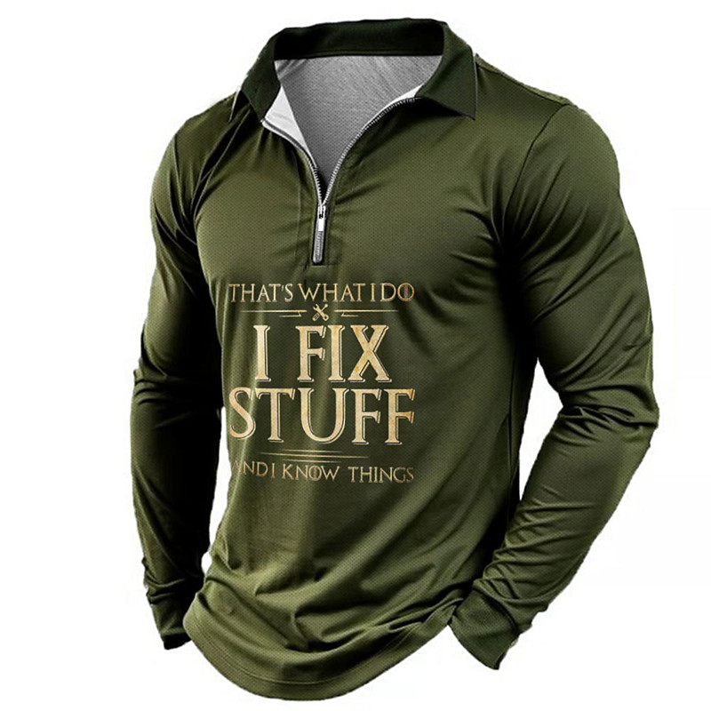 Men's Long Sleeve Graphic T-Shirt featuring 'I Fix Stuff And I Know Things' Quote with Quarter Zip Collar
