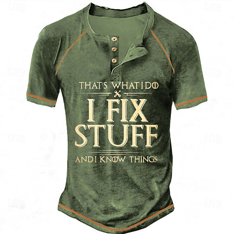 OUKU Men's Henley Shirt Tee Graphic Letter I Fix Stuff and I Know Things Henley Clothing Apparel 3D Print Outdoor Casual Short Sleeve Patchwork Button-Down Fashion Designer Stylish Vintage