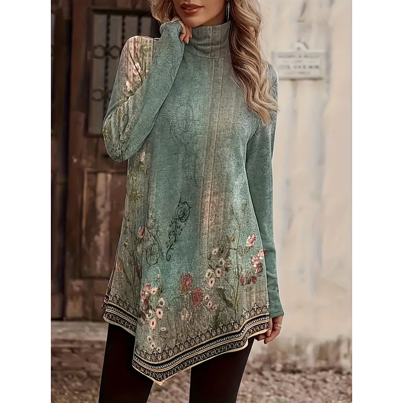 Women's T Shirt Floral Graphic Plants Casual Long Sleeve Turtleneck Long Tops Daily Print Asymmetrical Black and White Red Green Spring Fall