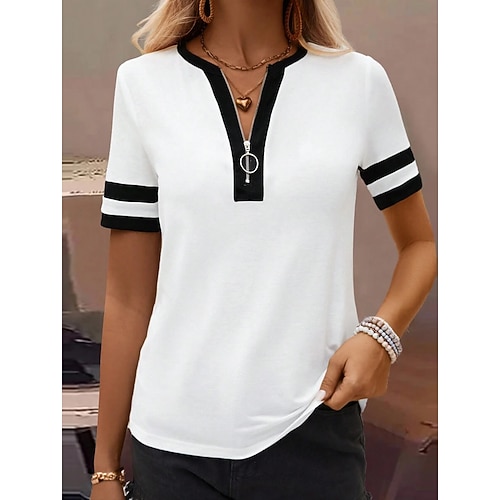 Per donna Maglietta Cerniera Grafico Geometrico Blocco di colori Vintage Hawaiano Elegante Manica Corta Girocollo Scollo a V Top Regolari Casuale Quotidiano Sportivo Blu Nero Bianco Estate Primavera