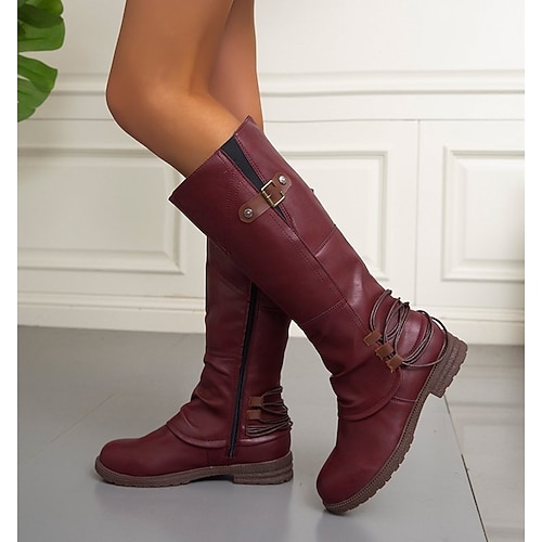 stivali da donna in similpelle rossa vintage alti fino al ginocchio con dettagli con fibbia - perfetti per avventure all'aria aperta, uscite informali e moda autunnale
