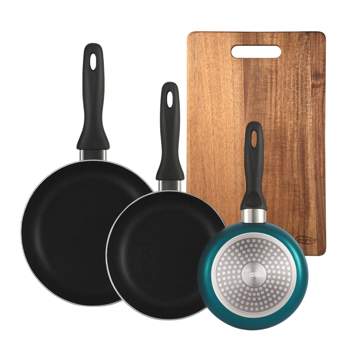 BERGNER - Set aus 3 Pfannen Ø16/20/24cm aus gepresstem Aluminium in metallic-blau mit Schneidebrett 40,3x25,2x2,5 cm aus Holz