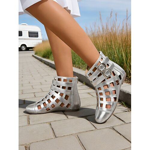 sandali gladiatore da donna con allacciatura alla caviglia in marrone, cerniera e fibbia – stivali boho piatti e aperti per festival estivi, campeggio e abbigliamento casual all'aperto