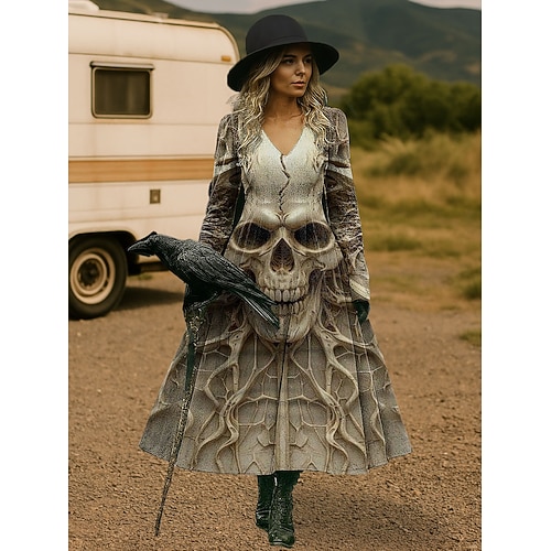 Abito da donna Midi A Linea Vacanza Casual Quotidiano Festa Data Fit Regolare Grafica Teschio Manica Lunga Collo a V Giallo Chiaro Blu Viola Verde Autunno Inverno