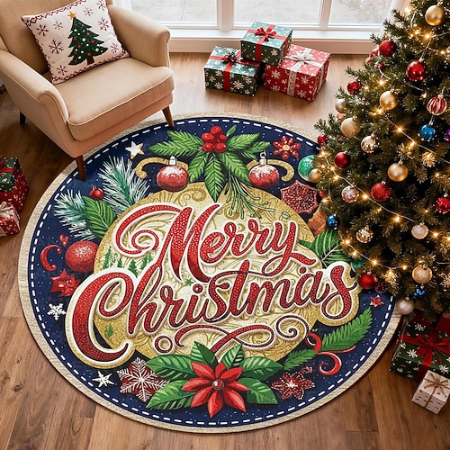 Tappeto rotondo natalizio, tappeto natalizio in finto cashmere da 350 g con decorazioni, stelle di Natale e foglie di pino, zerbino decorativo per soggiorno e camera da letto, 120 cm