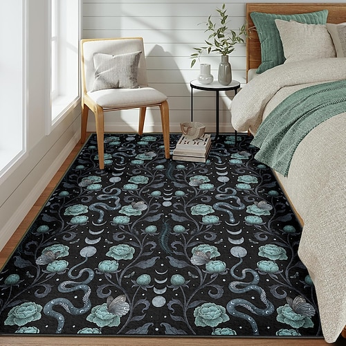 Tappeto con rose al chiaro di luna e disegno di serpente con fasi lunari e motivo floreale damascato, tema botanico gotico ornamentale scuro, decorazione resistente ed elegante per la camera da letto,