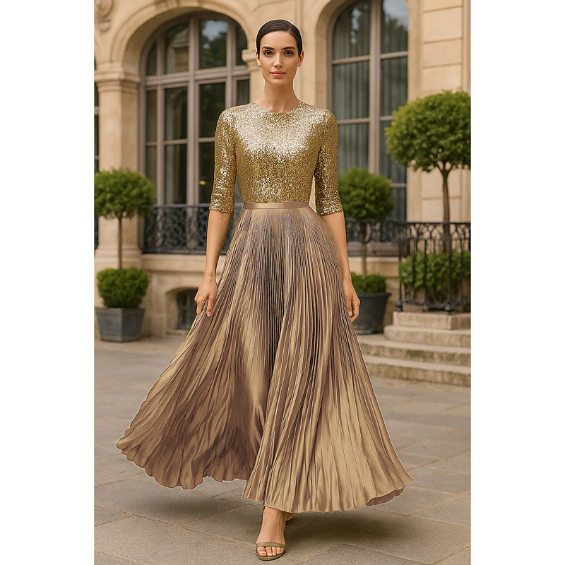 A-Line Floor Length Evening Gown Elegant Glittering Sparkle 3/4 Length Sleeve Boat Neck Garden Party Wedding Satin Sequined with Pleats