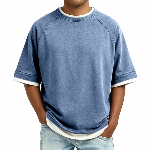 Herren Hemd aus 100 % Baumwolle in Säurewaschung Kurzarm Rundhalsausschnitt Sommer Frühling Einfach Retro Vintage Lässig Vintage-Stil Falscher Zweiteiler Gewaschen Lässig Blau Purpur Grün Top T-Shirt