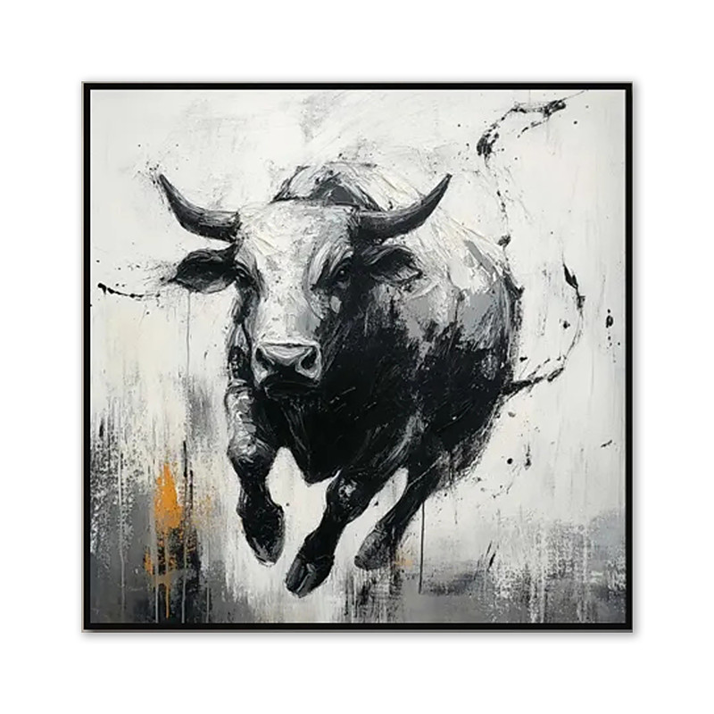 Handmade Oil Painting Acrylic Canvas Wall Art Decoration Animal Oil Painting Black-and-White Running Bull for Home Office Hotel Club Decor Rolled Frameless Unstretched Painting