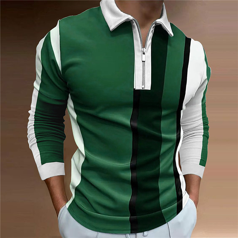 Men's Striped Zip Polo Shirts Golf Shirt Long Sleeve Polo Shirts Collared Shirts Business Casual WorkWear Formal Wear Festival Wear 3D Print Quarter Zip Polo Navy Blue Dark Green Brown