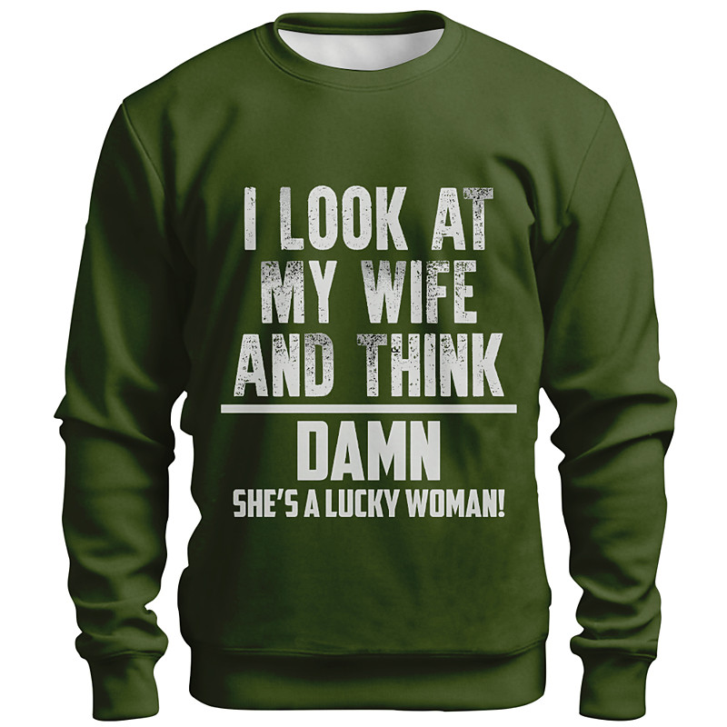 Men's Long Sleeve Sweatshirt Funny Red Graphic - 'I Look At My Wife And Think Damn She's A Lucky Woman' Husband Humor