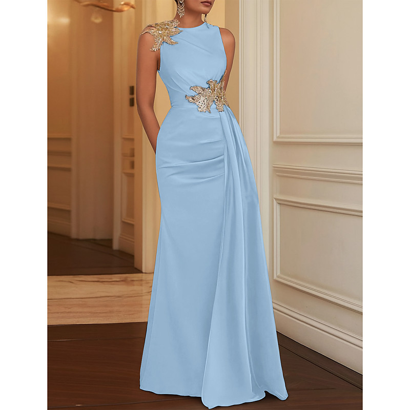 Sheath Column Floor Length Evening Gown Ball Gown with Overskirt Formal Dress Elegant Black Dress Sleeveless Jewel Neck Christmas Formal Pocket Satin with Embroidery