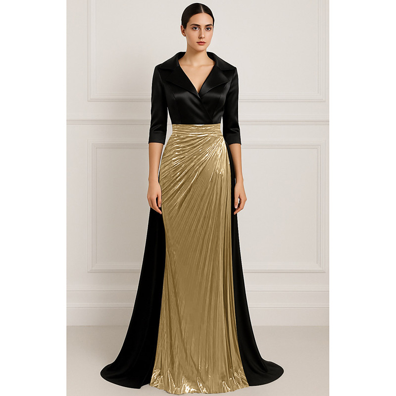 A-Line Floor Length Beaded Eembroidered Formal Dresses Mother of the Bride Dress Evening Gown Ball Gown Formal Dress Elegant Color Block High Split Half Sleeve Shirt Collar Wedding Formal Satin with