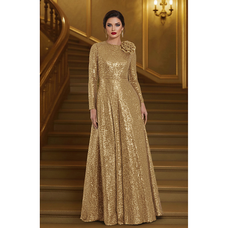 A-Line Floor Length Evening Gown Ball Gown Formal Dress Elegant Glittering Silky Long Sleeve Crew Neck Wedding Formal Pocket Sequined with Glitter
