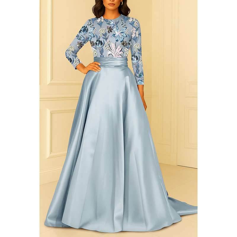 A-Line Floor Length Beaded Eembroidered Formal Dresses Mother of the Bride Dress Evening Gown Ball Gown Formal Dress Elegant Silky Long Sleeve Crew Neck Wedding Formal Pocket Satin Lace with Pocket
