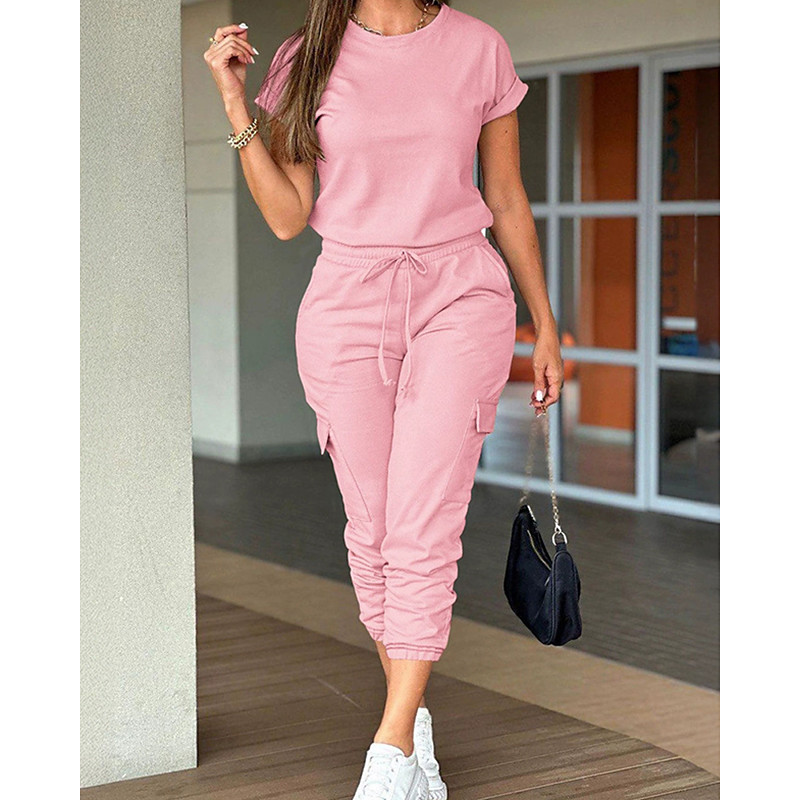 Women's Normal Jumpsuit Streetwear Solid Color Short Sleeve Crew Neck Drawstring Pocket Street Daily Regular Fit Black Light Green Pink Fall